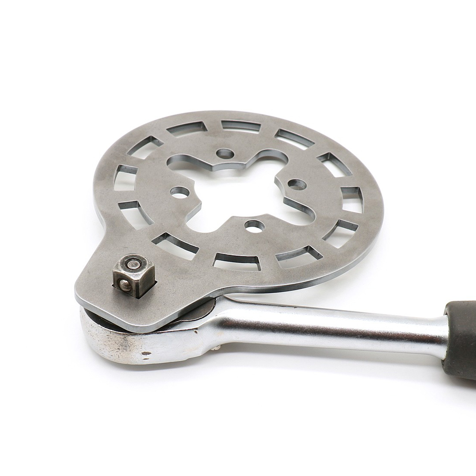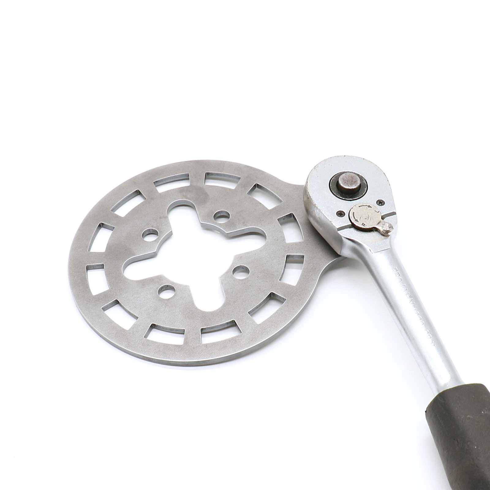 Das Werkzeug wird auf die vier Führungsbolzen und über den kompletten Kupplungskorb gesteckt. In das Vierkantloch wird entweder eine Ratsche oder ein entsprechender Hebel gesteckt mit dem gegengehalten wird, dann mit dem Drehmomentschlüssel wie vorgeschrieben die Mutter des Kupplungsmitnehmers festziehen.